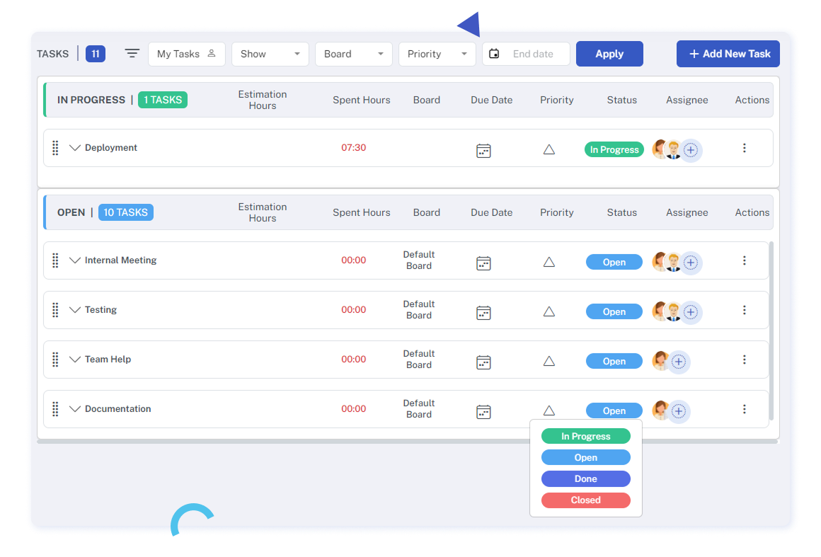 You can set the task views in a List Board, and create your own status labels or use default ones like Open, In Progress, Done, and Closed.